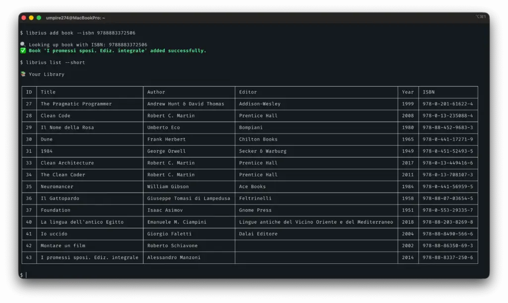 Librius is an open-source CLI application designed for readers, book collectors, and personal librarians.
